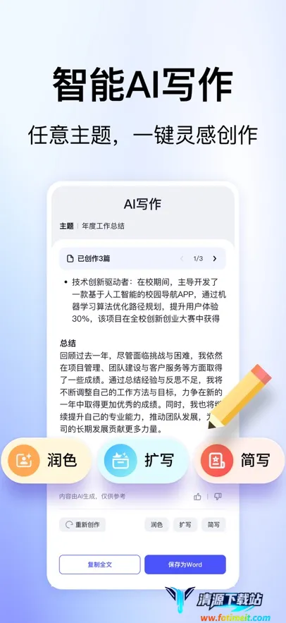 智能写作效率高:接入先进技术,支持任意主题一键灵感创作,还能润色、扩写、简写,适配多种场景,提升写作效率与质量。