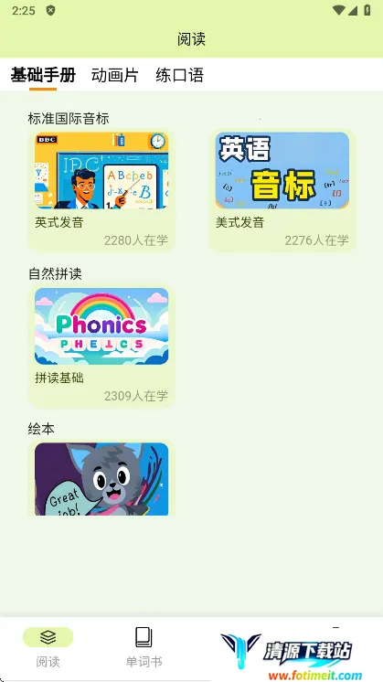 2、首页界面展示了基础手册、动画视频与口语练习模块,用户可根据学习目标自由点击。