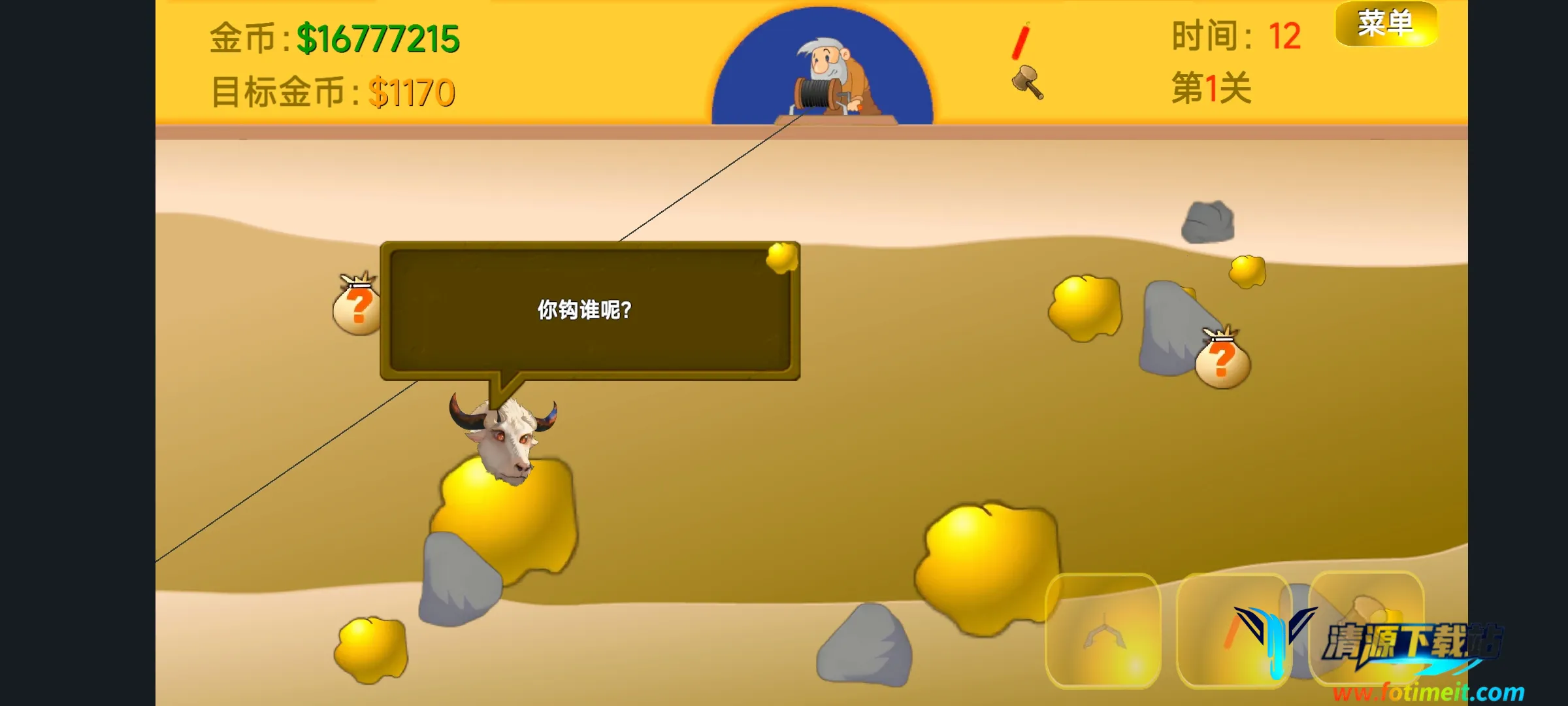 黄金矿工指导版是一款超有趣的游戏!它是玩家自制的黄金矿工同人改版,由UP主头牛o制作。这游戏能满足你对挖掘闯关的乐趣需求。它延续经典牛头形象,AI会引导你抓取物品,有时还捣乱,增加不少趣味性。在游戏里,你要在不同关卡完成挖掘任务,矿洞有丰富的黄金、宝石、福袋等资源,还有各种障碍物需躲避。玩法简单,下载安装后点击play进入,规定时间内抓住金矿得目标分数,钩子对准金矿点击屏幕就能抓取。过关能获金条,还能用金条买工具得更高分数。这里有金块、石头、钻石等各种道具。它还有隐藏关卡哦!玩的时候多摸索,像除钻石关有问号先拿问号,两侧东西比中间好拿等技巧,能帮你发现更多隐藏关卡的乐趣,快去试试吧!