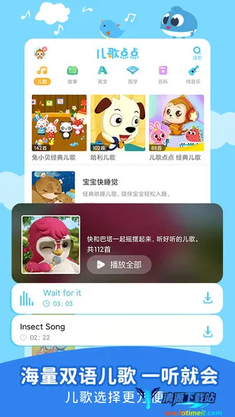 如果你想免费下载儿歌点点动画片全集,同时还想玩单机斗地主,那这款软件就能满足你。儿歌点点是一款超棒的早教育儿软件,有海量经典儿歌、优质动画、益智故事、英文启蒙等资源,像小猪佩奇、超级飞侠等热门IP应有尽有。界面专为孩子定制,宝宝操作轻松。还有护眼模式和时间锁功能,保护孩子视力,助其养成良好习惯。这里儿歌多多,动画不停,故事丰富,能从小培养孩子音乐天赋等。而且支持高速缓存、离线播放,节省流量。在这不仅能满足孩子看动画片学知识的需求,还能找到单机斗地主来娱乐放松,让孩子在快乐中成长,家长们快来为孩子下载体验吧!
