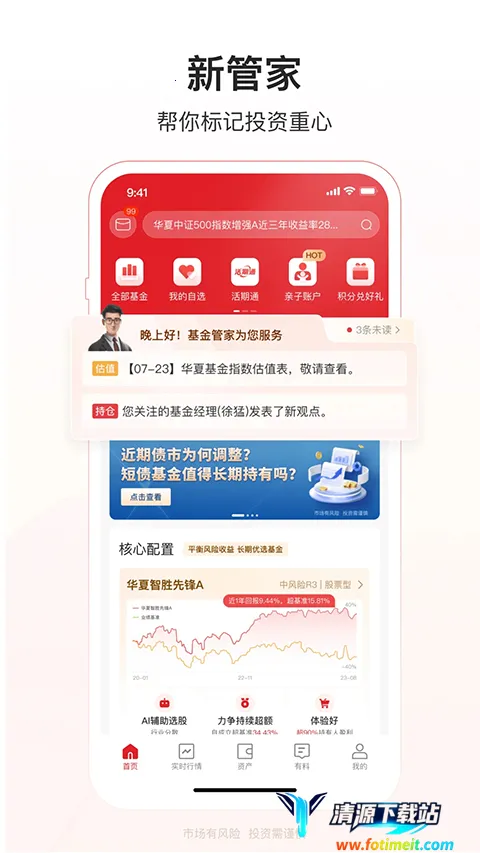 华夏基金管家亮点突出。它整合多种实用功能,可随时随地进行认购、申购等多项操作。能实时查询账户余额、损益分析等。活期通货币基金理财便捷,随手存随时取随心用。还可便捷查询产品每日净值涨跌幅及历史净值走势,以及沪深两市股票信息和全市场基金净值信息。对于理财小白有定投类产品,一键定投省却选基择时和操作烦恼。无论是交易、查询还是理财,都能为用户提供全面且优质的服务,是投资者的得力助手。