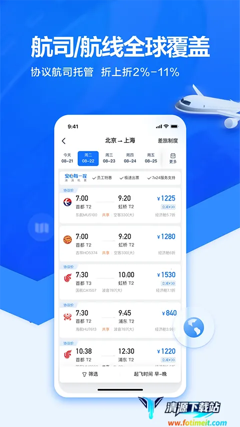2、全场景自主供应链:安全可靠,优价保障,一个App就能实现用车、订机票、订酒店全链路预订,满足多种出行及商旅需求。