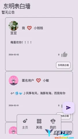 东明表白墙是一款手机表白平台。其页面设计简约清爽,给人良好视觉感受。所有功能全程免费无广告,使用起来十分舒心。在这里,用户既能随心发布表白信和各类情话,将未出口的情话、埋在心里的思念尽情记录,又能查看随机情话和随机一言,还有超多温暖每日一言可一键复制分享他人。支持一键切换实名或匿名发布,让表达心意毫无压力。注册流程也不复杂,按步骤操作即可完成。无论是想要大胆表白,还是默默倾诉,东明表白墙都能满足需求,是个不错的表达心意的平台。