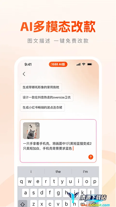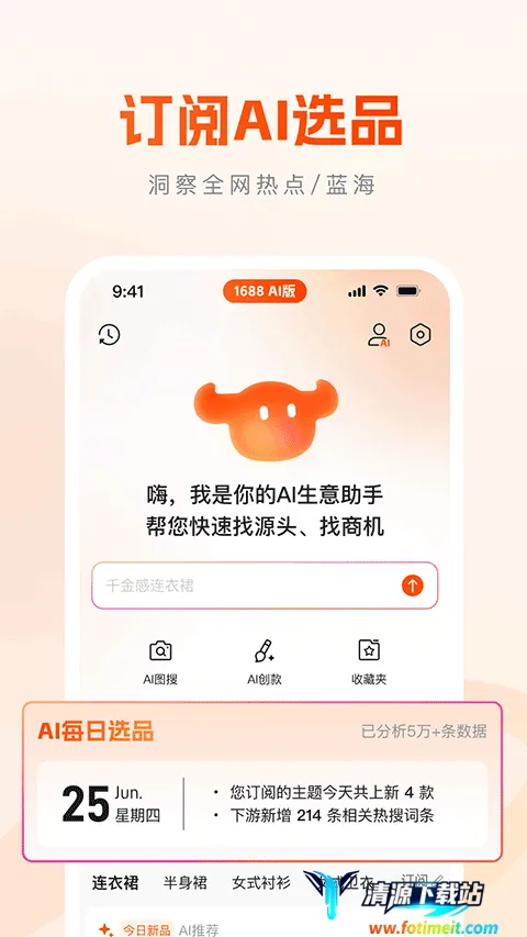 1688 AI2026官方正版是一款AI选品工具软件,基于1688平台数据,为分销商等人群提供个性化选品资讯。支持图片智能搜索、配置专属Agent,还有商品改款等功能,助力高效选品,实现生意增长。