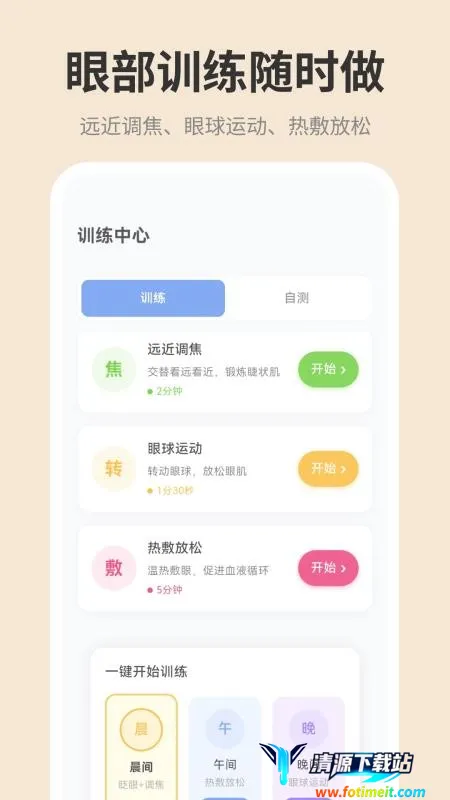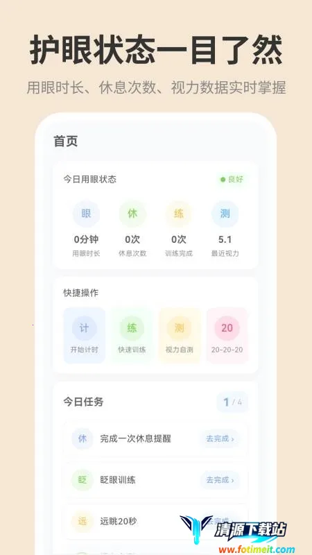 3. 功能丰富:具备眼球专业放松训练,定时提醒完成护眼任务,还有眼部测试助你了解眼睛状况。