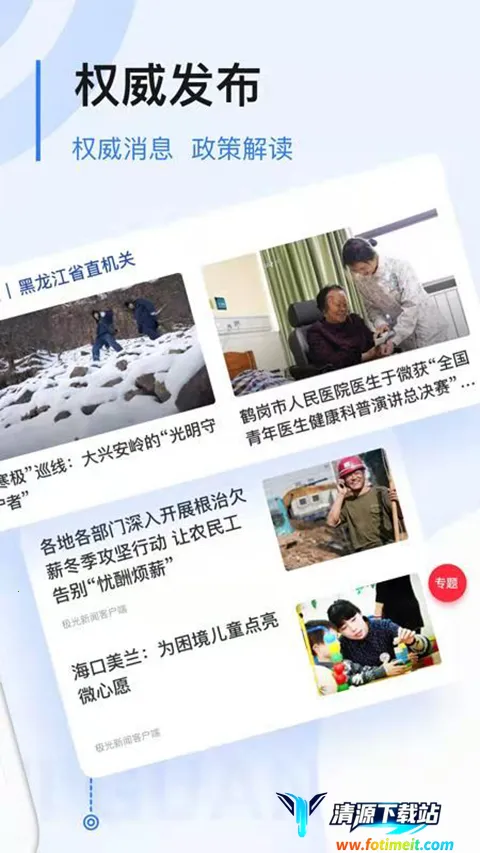 黑龙江极光新闻是黑龙江广播电视台打造的新闻服务平台,集权威快速真实新闻、分类精品推荐、政策解读等功能于一体。有新鲜资讯、爆料线索等特色,还能网上办事,拉近百姓与政府距离,致力于打造多个平台,方便用户免费下载体验。