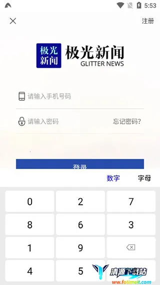 1、在本站下载打开极光新闻app官方手机版,输入手机号、密码进行登录,没有帐号的用户点击右上角的注册进行帐号申请;