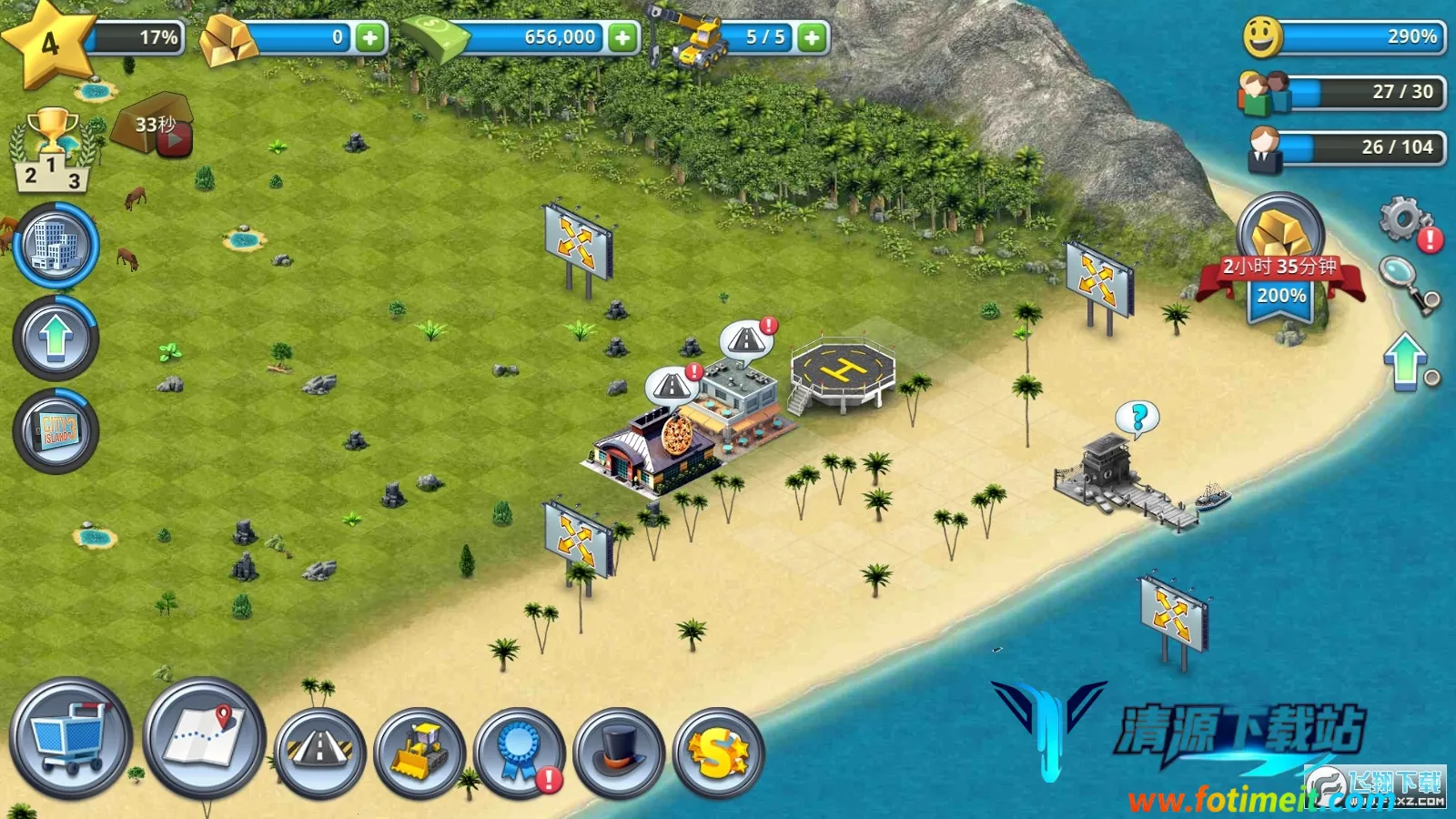 3. 解锁岛屿提升幸福:采用地区解锁方式,升级可解锁不同岛屿,城市能建在旅游天堂岛、火山岛、沼泽地、沙漠等。要建设公园、河道等美化区域提升居民幸福指数,这关乎经验与奖励,合理规划才能打造魅力家园。