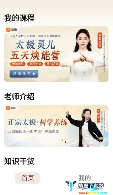 1、打开太极讲堂app,进入软件首页,可查看我的课程老师介绍等