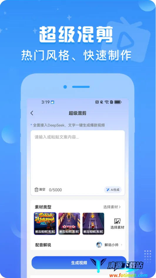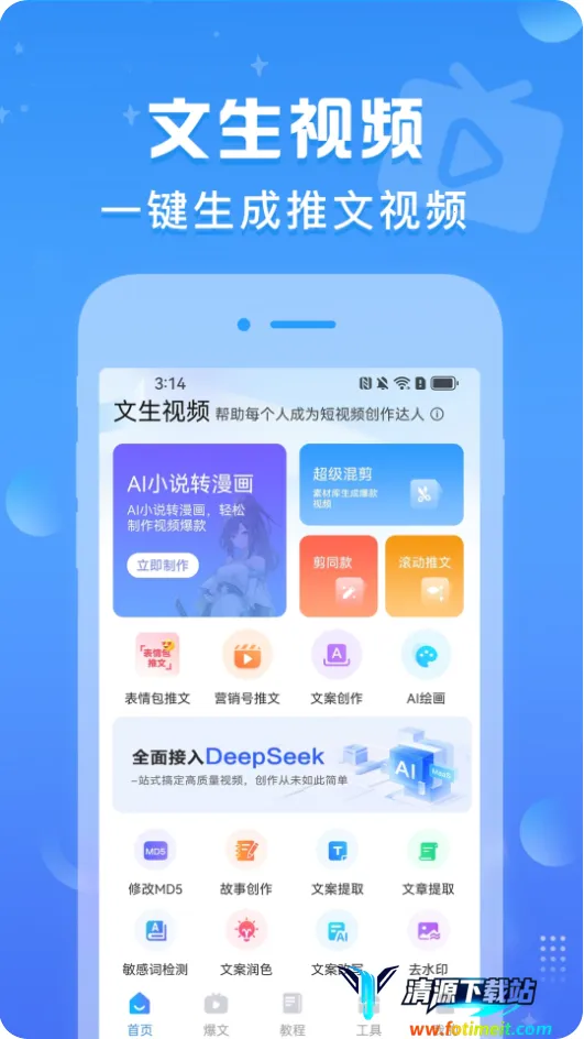 文生视频软件能帮你轻松解决视频创作难题。它具有强大的视频创作功能,剪辑系统融入deepseek大模型,提供丰富剪辑模板。只需导入手机内视频,就能自动完成剪辑,支持文字声视频功能,可按文字需求自动制作优秀视频。制作出的视频无水印,方便发至自媒体平台。软件内置超多视频创作教学,助你学会制作优秀视频。还支持音频导入,能为视频添加好听的背景音乐。其亮点在于完成下载后授予系统权限即可使用剪辑功能,联网才能调用deepseek大语言模型,也可将常用功能放主页。特色是储存创作记录,方便随时查看;成为会员后,使用deepseek次数无限制;剪辑遇疑问可随时查看使用教学。此外,用户能在论坛与网友讨论创作技巧,激发灵感,内置完善系统工具库,实现复杂剪辑操作,制作更优秀的视频。