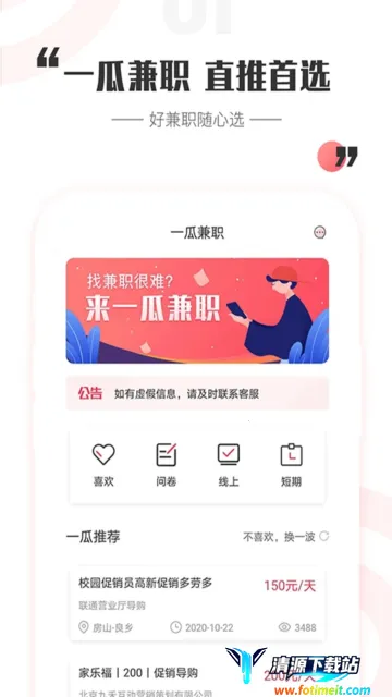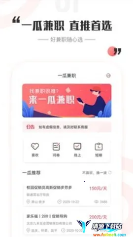 一瓜兼职是靠谱的兼职赚钱软件,每日发布多样兼职,涵盖线上线下。智能推送人气兼职,企业严选保障可靠,收益透明当天结算,支持微信支付宝提现,还有多种赚钱方式,助你轻松兼职。