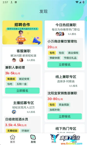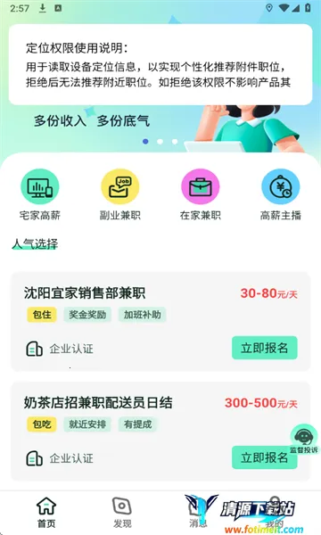 2、自动推送兼职信息:完成软件安装并完善个人信息后,系统会根据用户所在城市,自动推送这座城市所发布的兼职信息,方便你快速获取适合自己的兼职。