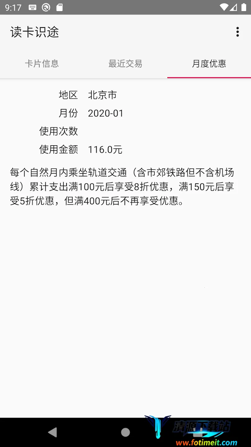 3. 优惠进度可视:针对支持月度折扣政策的交通卡,能显示累计消费金额及优惠进度,帮您合理规划出行,最大化享受优惠。