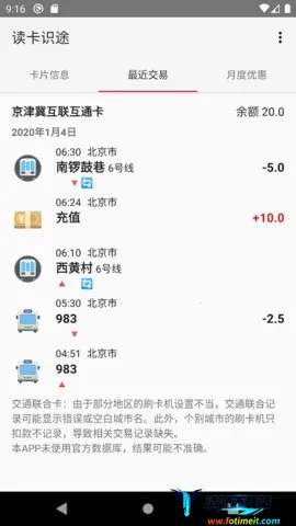 读卡识途App一般不会识别路线错误。它是一款超棒的公共交通卡信息管理与出行服务软件。通过NFC读卡技术,能快速读取公交卡信息,不用联网就能实时显示卡内余额和最近消费记录,随时掌握卡片状态。还能查看详细交易历史,包括乘车车站、公交路线等,方便费用管理与核对。对于有月度折扣政策的交通卡,能追踪优惠进度,帮你合理规划出行,最大化享受优惠。而且它跨城市兼容,覆盖全国大部分城市,像京津冀、上海、广州、深圳等地的多种城市卡及T-Union交通联合卡都能用。日常通勤时,能轻松管理余额和消费记录,避免余额不足尴尬。跨城市出行也方便,还能规划路线。有了它,出行更便捷高效,不用担心路线识别错误等问题,快来下载体验吧!