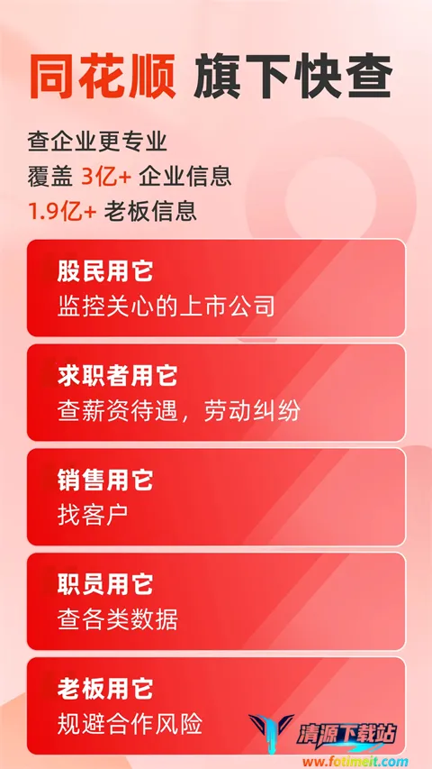同花顺快查是同花顺旗下免费大数据查询工具,能查企业、人、数据、风险等。覆盖1亿8千万企业征信,有智能企业搜索、风险内幕模块等功能,融入AI秘书,可反馈问题,还修复了v8.2.5版本已知问题。