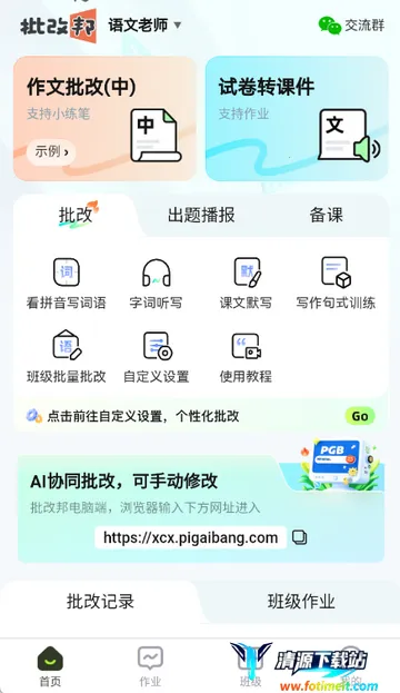 批改邦是一款专为教师打造的专业作文批改类 APP。它能大幅减少教师重复操作,节省批改时间,提升备课效率。支持 AI 人工协同批改,精准指出问题并给出建议。覆盖作文批改全流程,贴合教师实际教学需求。适配不同批改习惯,打造专属批改助手。还具备写作素材、批改报告等功能,兼顾教师备课与学生写作提升。适用于各类有作文批改需求的教师,能全面提升教学质量,解决作文批改难题。