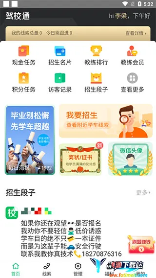 1、下载进入驾校通,在首页中可以看到有招生名片、教练会员、招生段子等功能,更有更有效的进行招生;