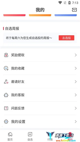2、软件提供了四大主要板块、分别是首页、自选、行情以及我的管理。