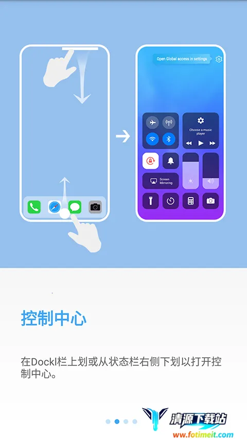 在dockl栏上划或从状态栏右侧下划以打开控制中心。