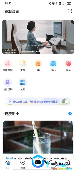 语音智能办公,高效连接乐歌升降桌、健身车等智能设备,一键操控。内置AI 健康管家,自动统计久坐、心率数据,定制专属健康计划。支持微信登录,语音查询百科、天气,提供日程待办与海量有声资源。界面简洁,操作便捷,助您打造健康有序的智能办公新生态,是职场人士的理想助手。