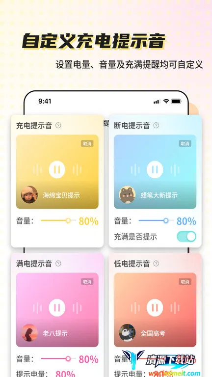 1. 海量个性化充电提示音:提供明星声优、动漫角色、热门梗等多元风格的充电提示音库,用户可自由选择并自定义充电断电充满低电量等场景音效,还能录制亲友专属声音,让充电过程趣味十足且充满情感温度。
