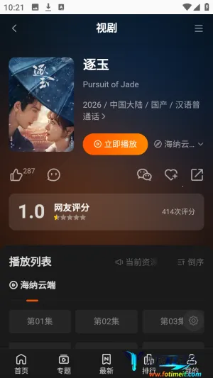 3. 观影体验好:可根据网络环境智能调节1080P蓝光4K等清晰度,搭配倍速播放、跳过片头片尾等实用功能,大幅提升观看体验,为用户打造高效舒适的观影环境。