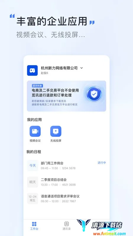 丰富应用能力:为企业用户提供视频会议、无线投屏、企业通讯录等丰富的企业级应用功能,满足企业对内管理和对外沟通需求。