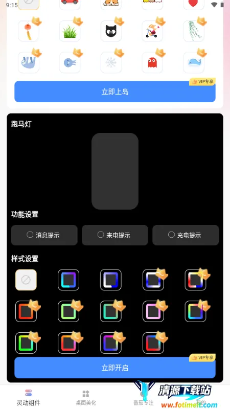 一款专注手机桌面美化的应用,集通知增强、桌面美化与效率工具于一体。能将重要消息置顶悬浮,快速查看关键内容,提升信息处理效率。支持多场景跑马灯特效自定义,充电来电消息提醒有专属灯光效果。提供丰富个性化组件与壁纸资源,可自由组合搭配。内置番茄专注计时功能,助用户高效管理时间。整体轻量化运行,占用资源少操作流畅,兼顾实用与美观,满足多种需求。