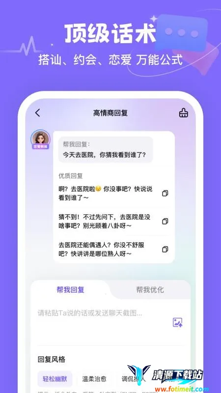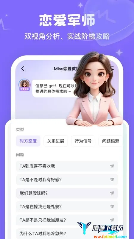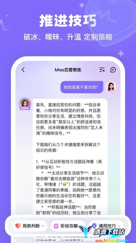 Miss恋爱教练是恋爱话术指导app,输入对方资料模拟真实人物对话,依对方回复生成合适话术。能双视角分析、进行情感剖析,助你掌握恋爱技巧、提升情商,轻松与对方聊天。