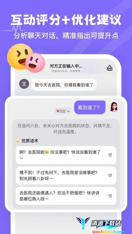 在恋爱交流的领域中,有一款应用备受关注。它以独特方式助力用户聊天互动,让聊天不再有困扰。通过个性化指导,每次聊天都趣味十足。用户无需再担忧陷入聊天僵局,能轻松应对各种场景。在与异性交流时,它能帮助塑造良好沟通氛围,成功吸引对方兴趣。无论是青涩的恋爱初期,还是需要增进感情的阶段,它都能发挥作用。它为恋爱中的人们提供了别样的支持,让聊天成为增进感情的有效途径,成为恋爱路上的得力助手,助力人们更好地把握情感交流的契机,享受恋爱中的美好互动。