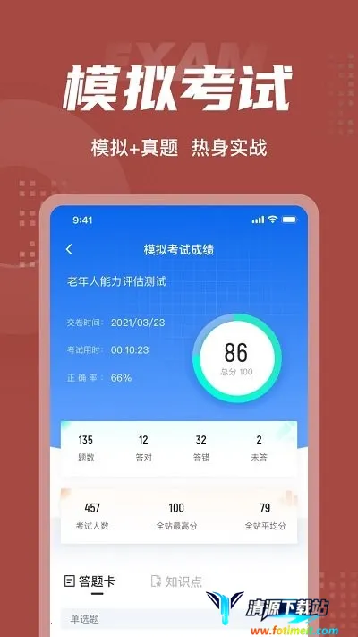 这款备考工具优势显著。它涵盖海量题库,有历年真题与模拟试题,能全面覆盖知识点,真实还原考试场景,助用户适应考试节奏。智能搜题功能强大,支持文字、语音、拍照搜题,快速出准确答案与详细解析,提升学习效率。模拟考试提供全真环境,限时答题自动评分,可帮用户查漏补缺。错题整理能自动汇总,支持反复练习,避免重复犯错。其使用场景丰富,适合备考冲刺、日常积累及专业提升。无论是即将考试的用户,还是养老机构从业者等,都能借助它高效备考,是一款值得尝试的备考App。