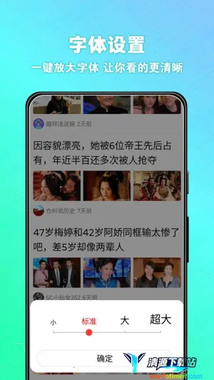 今日大字看这款软件很适合老年人和视力不太好的朋友。它能自动显示大字体,要是对字体大小不满意还能调节,看各种资讯超轻松。这里生活娱乐、搞笑健康、广场舞短视频啥都有,大字看得清楚,能有效保护视力。