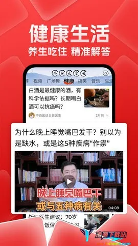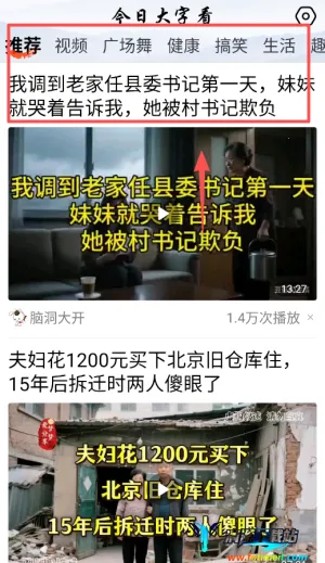 3、返回主界面选择感兴趣的内容板块,如健康或广场舞,上下滑动浏览短视频与文章,点开即全屏播放。