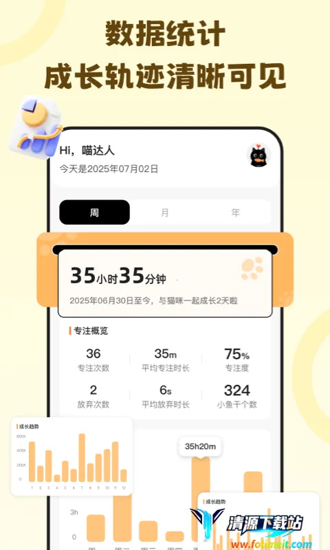 3. 能清晰记录成长脚印,让进步看得见,横向锁屏,集计划、集中、闹铃功能于一体,助你沉浸专注,告别手机瘾。