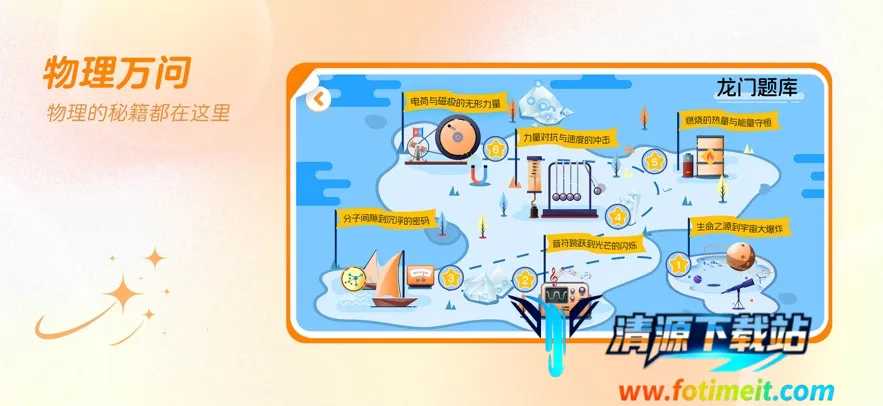 它功能超丰富,首页探索中心有多个核心入口,孩子能自由选学习路径。物理十分通以系列视频课程呈现物理知识,还有图解示范。龙门题库把知识变成冒险地图,闯关巩固学习效果。视频播放讲解清晰,音频故事能让孩子听着爱上科学。荣誉排行榜能让孩子获得勋章,增强成就感。