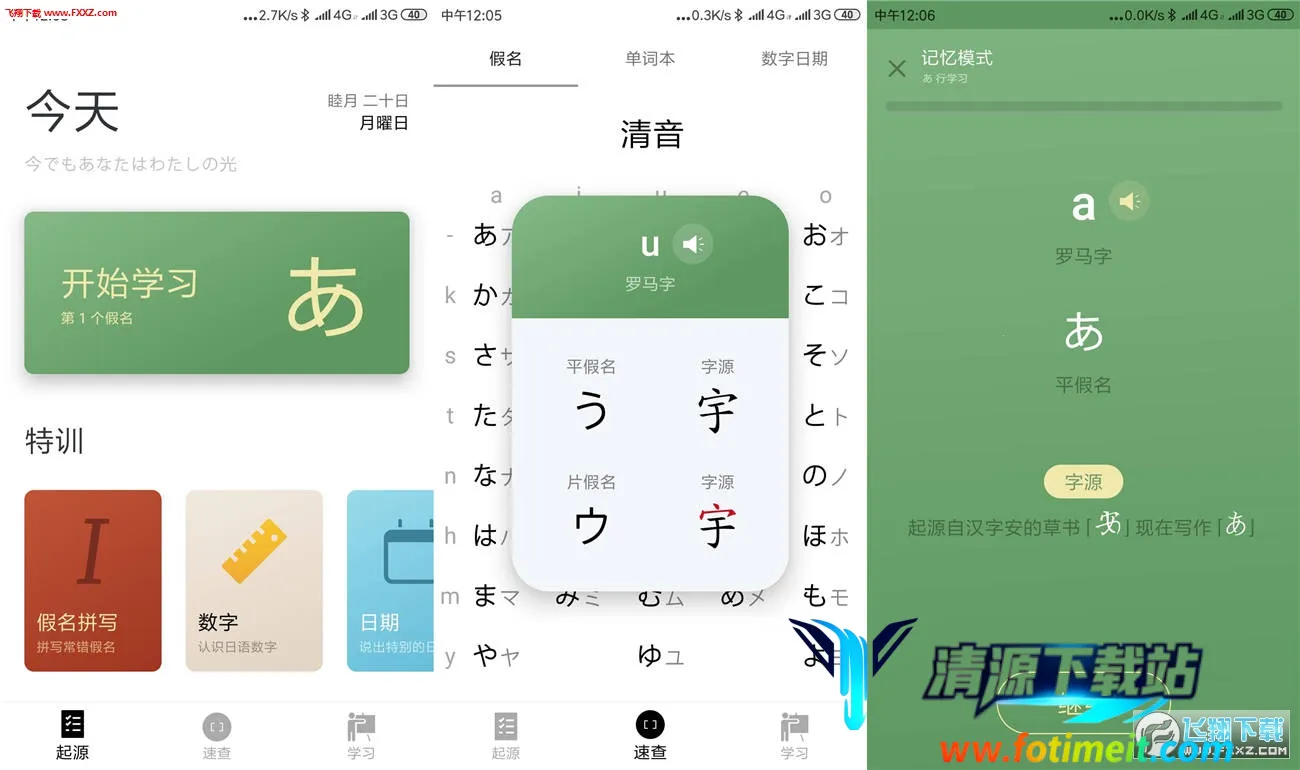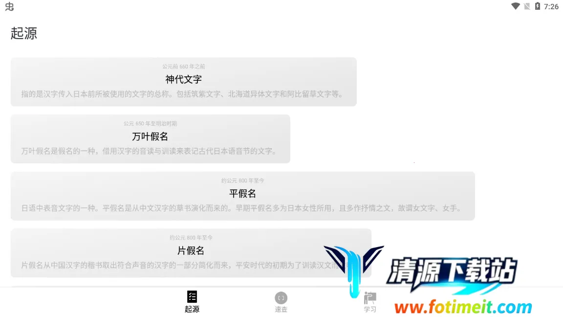 50音起源app是主打日语五十音学习的软件,有全新辅助学习模式与科学化办法。能带你了解假名起源及与汉字渊源,有速查、多种记忆模式,涵盖学习、测试、单词记忆等功能,还可免费使用资源。