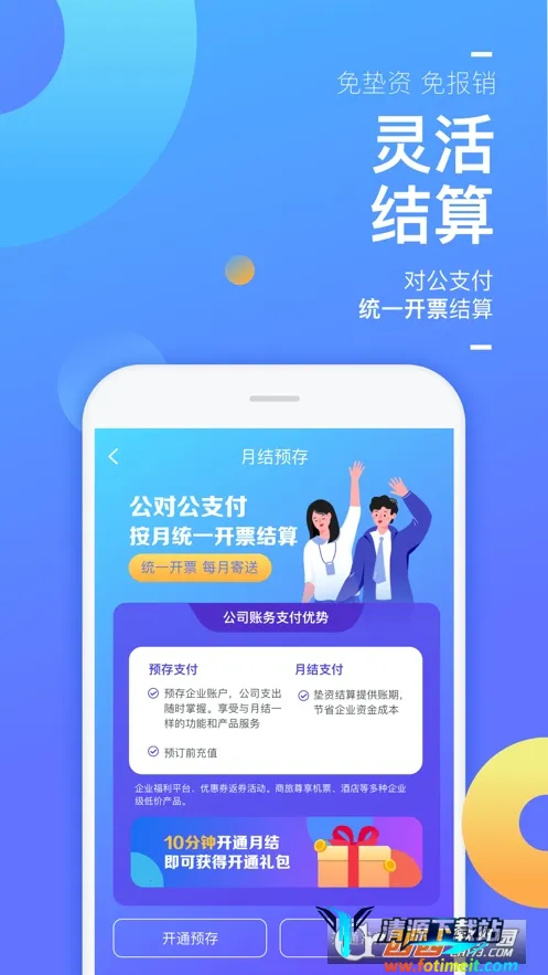 3. 支付方式多样:支持公司账户及个人账户支付,月结预存让员工出差免垫资、免报销、免发票,透明合规又便捷。月结服务涵盖多种差旅出行产品预订结算。