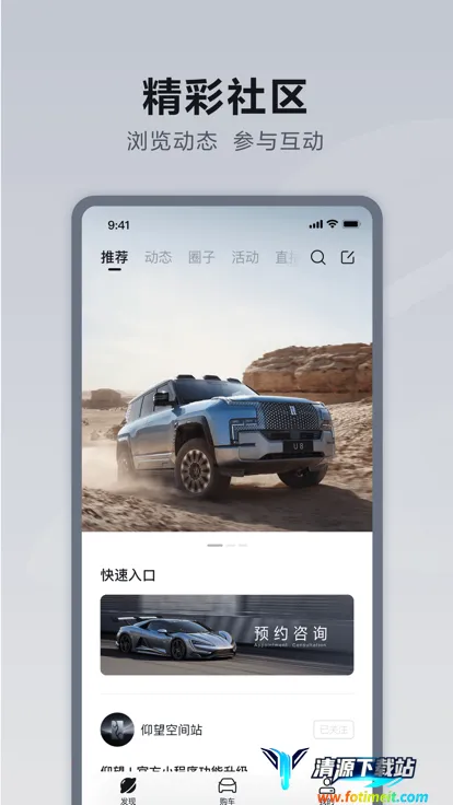 如果你想了解仰望汽车是什么品牌,那这款仰望汽车APP就能帮到你。它是比亚迪旗下的专属汽车服务软件。在这里,你能了解最新车辆信息和活动直播,还能在线预约试驾。软件功能超丰富,有动态板块可自由发布内容、浏览他人动态;话题板块能加入讨论;发现板块可参与活动、交流互动、收获好友。通过注册等行为完成积分任务能获取积分,还能以图片或视频形式分享精彩生活。它能解决你购车前资讯了解的问题,购车后也能分享经验。线上线下活动招募让你扩展圈子,直播能让你掌握前线动态。不管是车辆管理服务,如订单、报价、售后等,还是信息服务,它都能满足,操作简单又方便,能给你带来前所未有的汽车相关极致体验,有需要就赶紧来试试吧。
