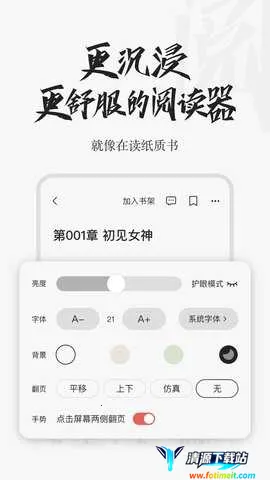 2、体验优质:以简洁清新的界面设计和流畅的操作体验著称,支持背景颜色、主题切换,字体、字号随意变换,还有夜间模式、护眼模式等,带来无与伦比的阅读享受。