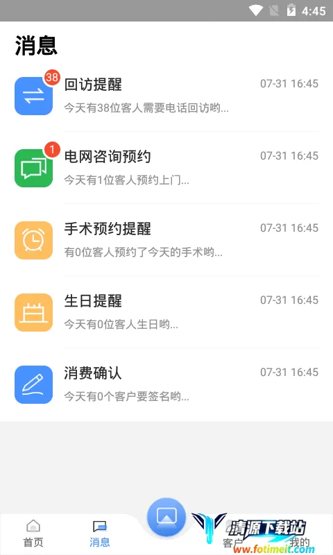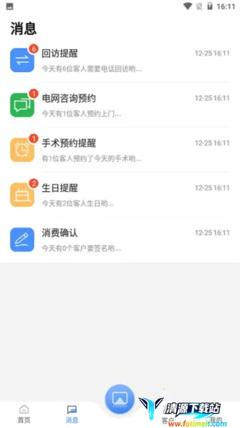 4. 消息自动提醒:包含回访提醒、电网咨询预约、手术预约、生日提醒、消费确认提醒等,及时知晓各类事务。