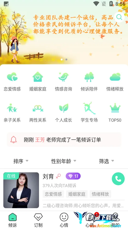 倾心倾诉app是一款超棒的心理资讯软件。它有超多专业心理咨询师,能帮你解决各种烦恼。不管是恋爱、婚姻、亲子关系问题,还是工作学习压力、情绪困扰等,都能在这里找到化解办法。