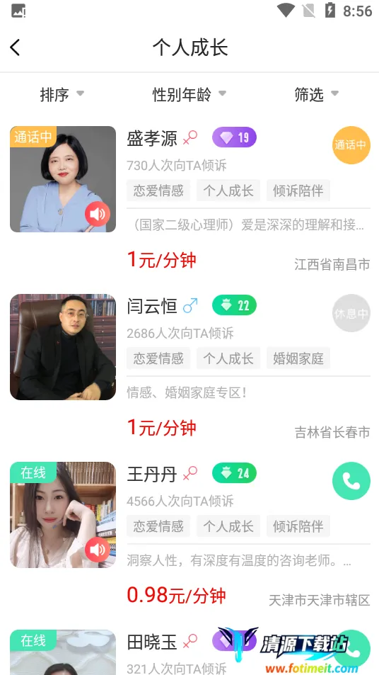 1. 专业咨询师团队:有大量专业心理咨询师,能为用户解决工作、生活、情感等各方面烦恼。无论是恋爱脱单、婚姻挽救,还是亲子关系问题,都能凭借专业知识提供有效帮助。