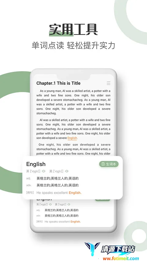 3. 双语对照与实时翻译,支持中英双语自由切换,点击单词可查看释义、例句及发音,适应不同学习阶段。