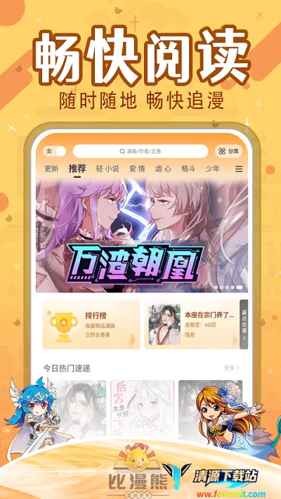 比漫熊漫画亮点众多。**海量资源**涵盖国内外热门漫画,国漫、日漫、韩漫等种类丰富,满足不同追番喜好。更新及时,能第一时间阅读最新章节。支持离线阅读,无需担心网络。界面简洁清晰,操作便捷,阅读体验流畅。多种阅读模式可自由调节。基于用户阅读习惯和喜好进行个性化推荐,还支持多平台使用且阅读进度同步,无论是资深漫迷还是新手都能在此找到心仪漫画。