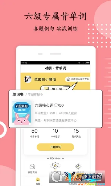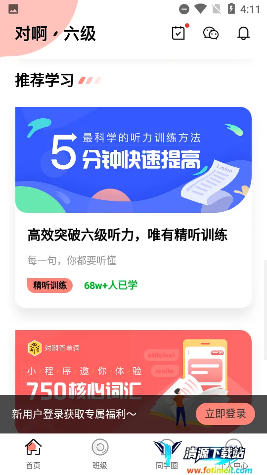 英语六级君2026官方正版备受青睐。它有海量真题,涵盖听力、阅读、写作等,助你熟悉题型。智能诊断能精准剖析薄弱环节。定制化学习依诊断结果自动推送适配内容与练习,打造专属备考计划。名师精讲详细视频深入讲解考点与思路。专项突破针对不同题型知识点设专项训练,帮你集中攻克难点。还有闯关背单词智能模块,趣味学习,轻松掌握,让你高效备考六级。