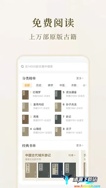 2. 分类详细易找,古籍按主题分类,还设有热门书籍排行榜、经典名著书单,方便用户通过搜索和分类功能,快速找到喜爱古籍。