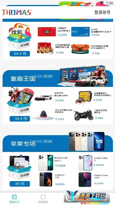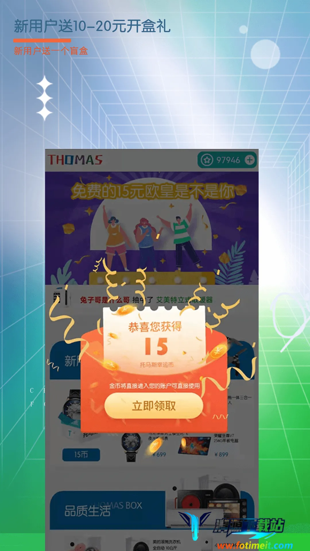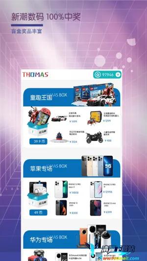 托马斯盲盒2026最新版本是一款购物盲盒软件,内置潮流商品与二次元手办,百分百中奖。购物达标可抽盒,不喜欢能退。有在线抽盒、潮玩资讯等功能,盲盒更新及时,商品正品有保障,还有售后客服。