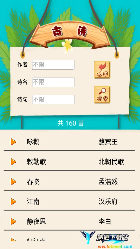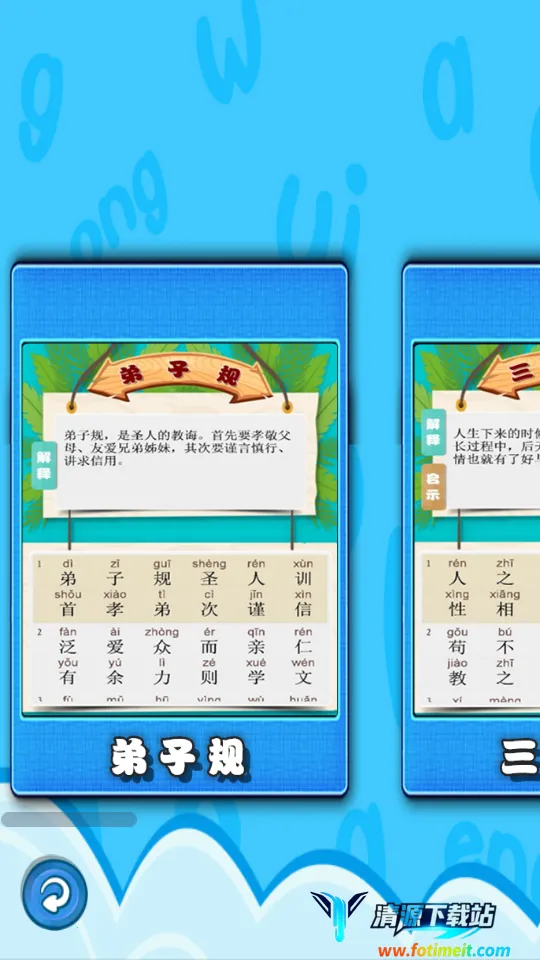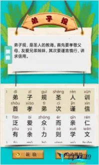 这款国学启蒙软件亮点多多。**动画背景模式**让孩子学习超有趣,能激发学习热情。提供丰富学习资源,涵盖弟子规、三字经等经典课程,包含天文地理、为人处事等学问。文学解释全面,助孩子深入了解历史国学文化。故事栏目查找便捷,输入作者、诗名等就能快速找到诗句。成语学习功能强大,拼音解释详细,助孩子掌握成语意思。有声阅读模式,带来更丰富体验,让孩子轻松学国学,爱上传统文化。