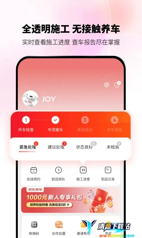 京东养车提供全方位养车服务。依托京东大数据与精细化选品,依车型和里程精准适配商品及服务,实现一站式保养。服务模式线上线下一体化,全程透明。车主购服务后,能APP预约到店,随时查排队进度,到店可看车辆详细报告。正品轮胎免费装,三年无忧质保,百万在线任你选。还有车主令牌,享六大养车特权。新用户优惠多,首单立减等让养车更实惠,让您养车无忧又便捷。