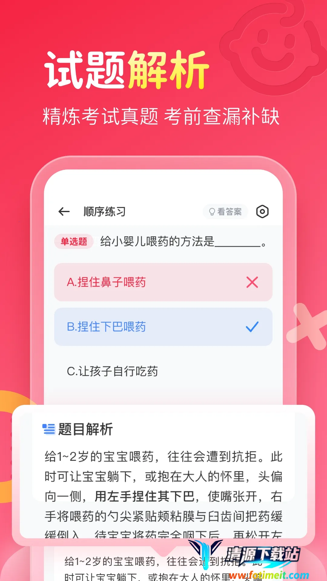 保育员考试宝典app是一款超棒的教育学习软件。它能让你获取全面的保育知识,通过系统化教学,让知识掌握更牢固。多种题型设计,方便你练习,满足各种学习需求。每次练习和模拟考后,会实时记录答题情况与成绩,助你掌握学习状况。除答案解析,还提供解题技巧指导,全方位帮你记忆知识点。它通过视频展示工作流程和技能操作,利于理解与实操。根据答题情况给学习状态反馈,帮你发现问题、调整学习计划。题目有详细解析和记忆窍门。视频还会剖析知识点内涵与应用。软件支持关键词搜题,节省时间精力。它收录海量真题,从报名到考试一站式服务。有在线练题、实时题库等功能,错题可记录复习,能按需求筛选学习内容。总之,这是一款好用又安全的学习软件,能有效帮你备考保育员考试。